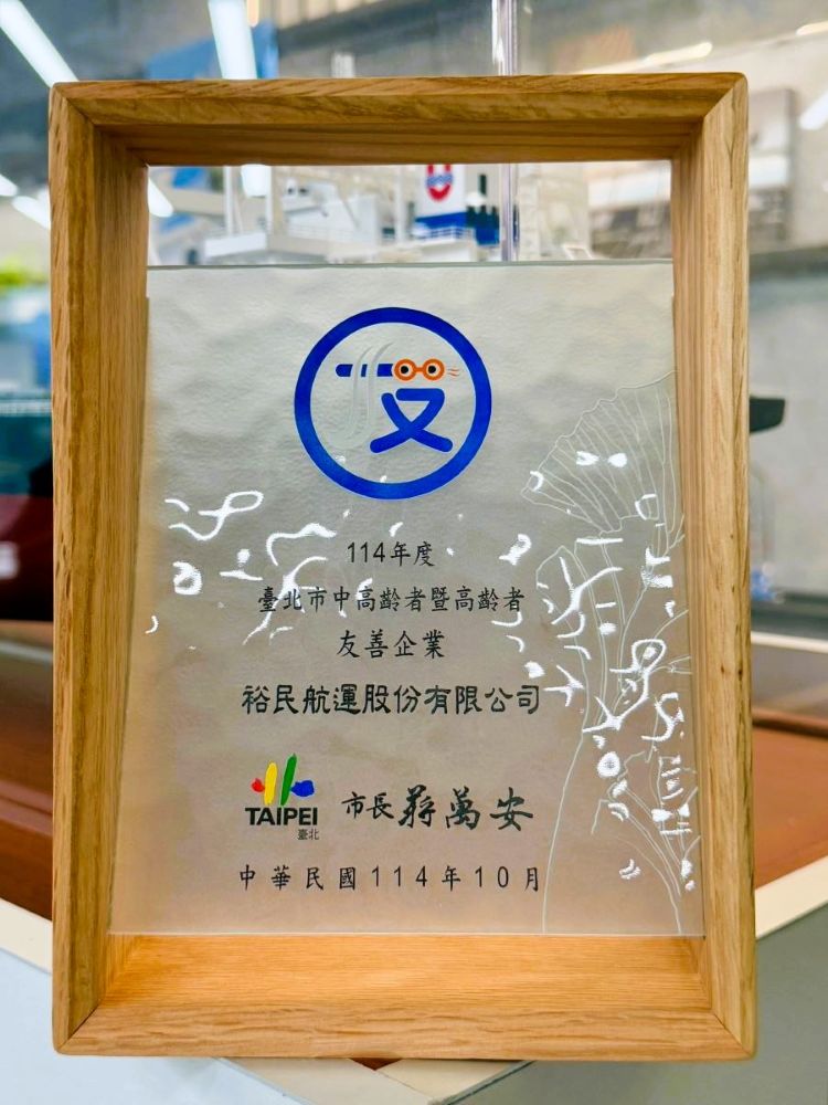 裕民航運致力營造友善、健康與共融的職場環境,今年榮獲臺北市政府頒發「中高齡暨高齡者友善企業認證」,首次取得此項殊榮,展現公司在推動多元共融、健康促進及中高齡友善職場方面的具體成果與持續努力。(圖 / 裕民航運提供)