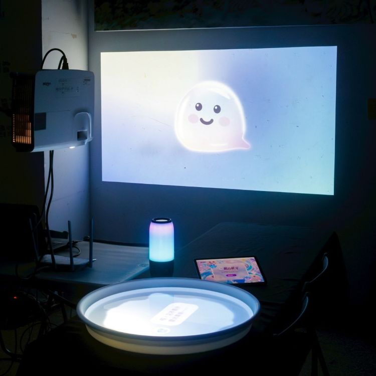 另一件作品《載符載沉》由李峻宇、葛芝羽、江倖衣、小崎晃志郎、廖晨皓與張凱紹共同創作,指導老師為陳彥彰。作品以數位溝通中的情緒傳遞為核心,運用 emoji 作為情感符號,並結合 GPT-4o 技術,將文字與表情轉化為帶有情感色彩的回應。系統可生成專屬情緒小卡,並以水面投影的方式呈現,象徵情緒在數位世界的擺盪與流動,邀請觀者重新思考數位時代中情緒的閱讀與傳遞方式。(上圖 / 元智大學提供)