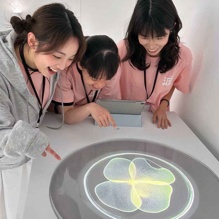 另一件《Biolink》則以「菌」為象徵,透過雙人互動,引導體驗者以溝通與合作共同培養出專屬菌種,象徵人際關係的多樣性。作品由蔡妘湘、陳嘉珍、陳昱安、沈羿伶、袁萱芳與蕭渝樺共同製作,運用生成式 AI 技術創造代表雙人關係的菌種圖樣,鼓勵參與者跳脫虛擬訊息框架,透過真實對話與肢體互動重新體會人際連結的價值。(上圖 / 元智大學提供)