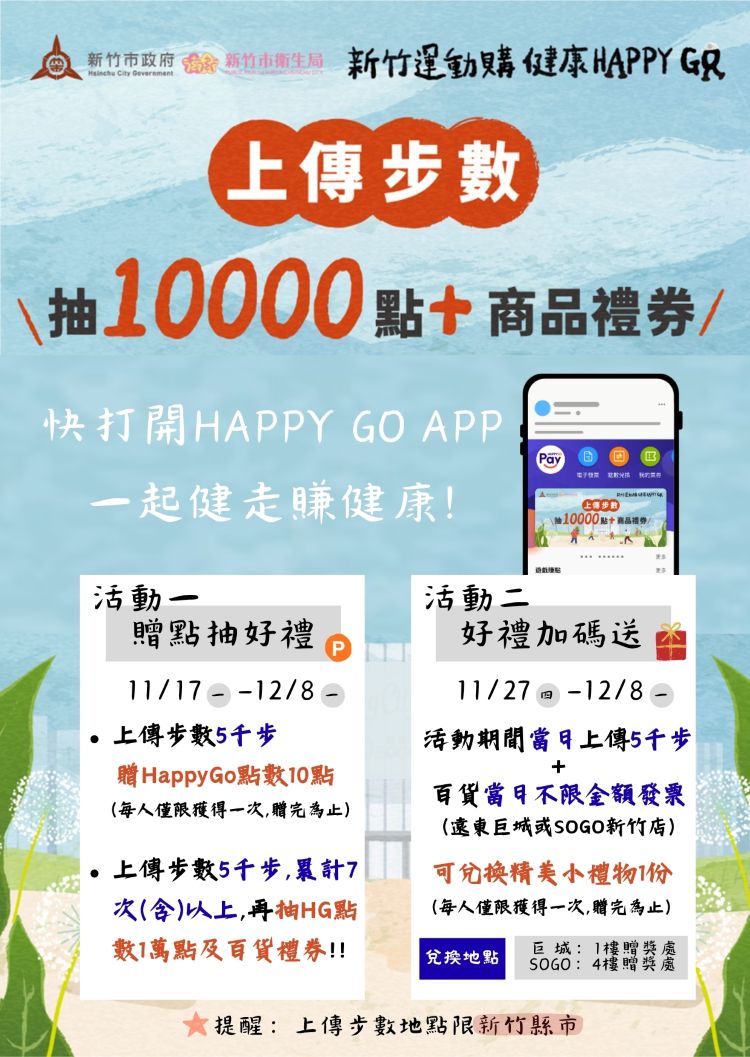 為推動全民健康生活型態,新竹市衛生局攜手Big City遠東巨城購物中心及SOGO百貨新竹店,共同舉辦「新竹運動購,健康HAPPY GO」線上健走活動,自即日起至12月8日止,只要透過HAPPY GO App活動專區上傳指定步數,不僅可獲得HAPPY GO點數,還有機會抽中萬元點數及商品券好禮。此外,百貨週年慶期間完成指定任務,還可加碼兌換精美好禮乙份,健康與驚喜一次GET!