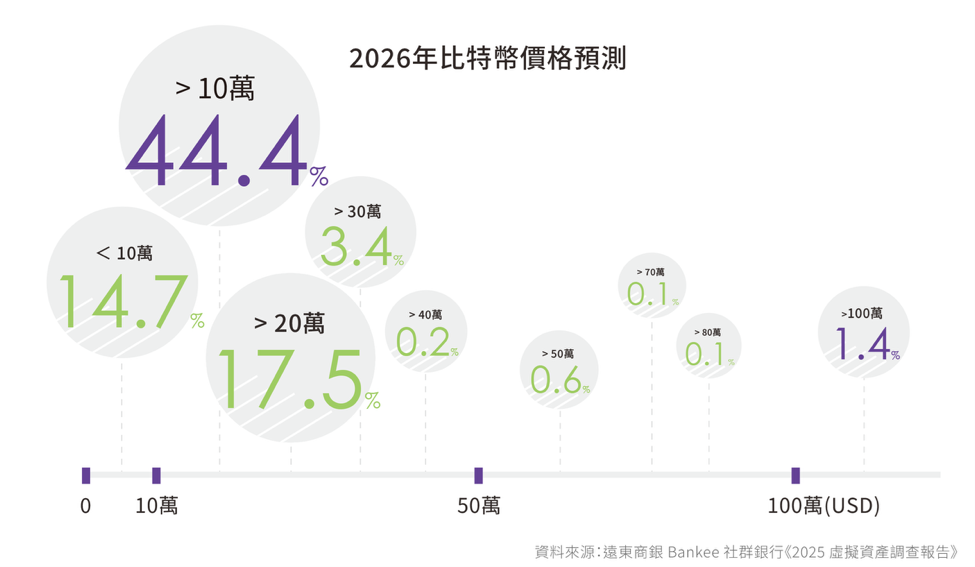 在比特幣價格預測方面,44.4% 受訪者預期 2026 年高點將落在 10 萬至 20 萬美元之間,另有 17.5% 認為將上探 20 萬至 30 萬美元, 更有 1.4% 預測比特幣價格將突破百萬美元,這反映投資人對比特幣長期價值的高度信心與樂觀預期。