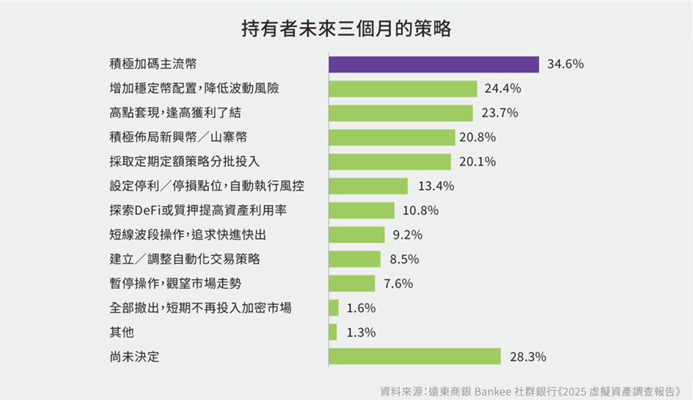 展望未來三個月的市場策略,持有者有34.6% 計畫積極加碼主流幣,如比特幣、以太幣,顯示對主流幣價值的信心不減;24.4% 打算增加穩定幣配置以降低波動風險,23.7% 則選擇逢高獲利了結,凸顯持有者一方面持續尋求報酬,一方面也在乎風險控管。