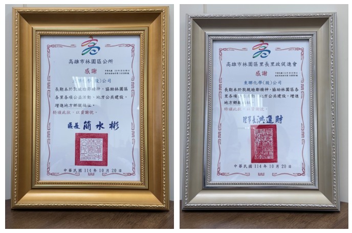 基於長期投入地方公益,東聯化學於2025年10月榮獲高雄市林園區公所及高雄市林園區里長里政促進會頒發感謝狀,肯定企業在促進社區和諧與發展方面的貢獻。這份榮譽不僅肯定了我們履行社會責任的努力,更鞏固了我們持續投入地方公益、促進社區福祉的使命感。(圖 / 東聯化學提供)
