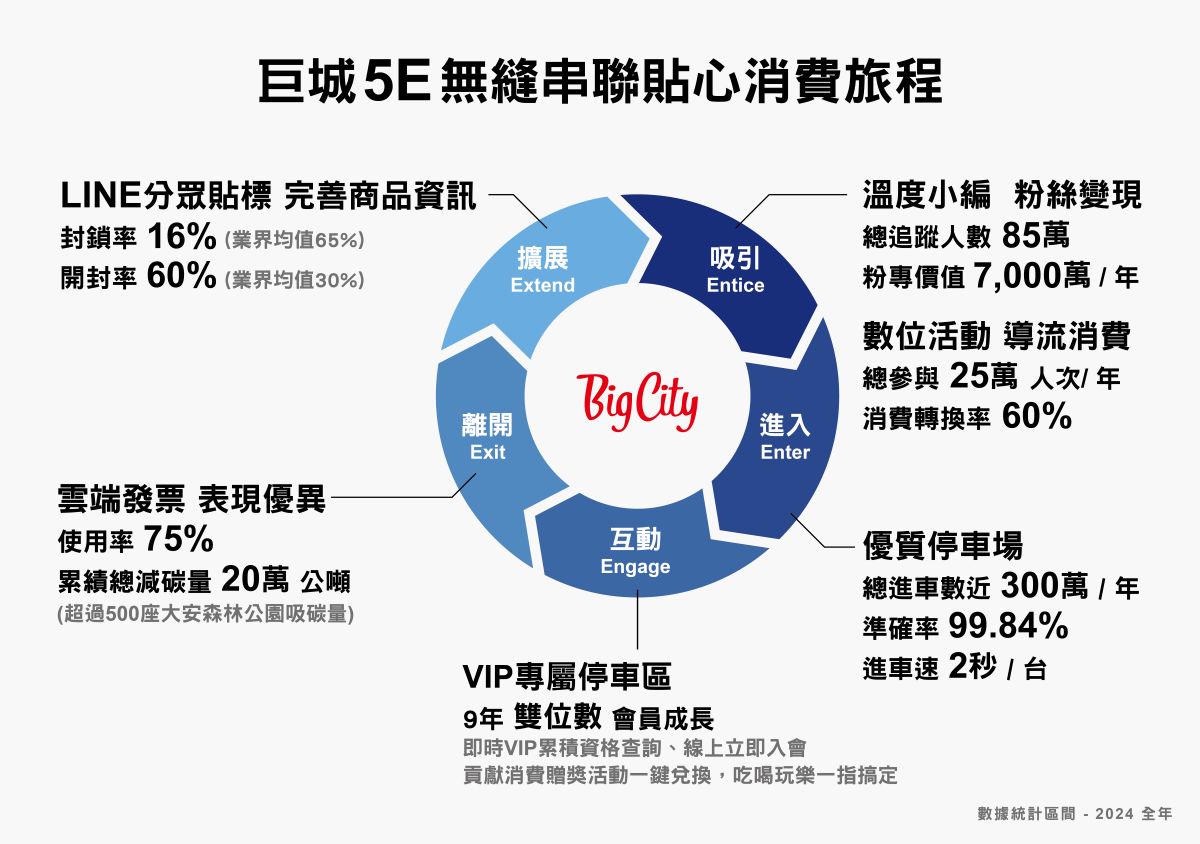 Big City 遠東巨城購物中心坐落於科技城新竹,因地制宜、率先推動數位轉型,更因時制宜、在面對零售業缺工挑戰,成功打造「數位雲巨城」,開幕迄今在FB、IG、LINE 及 APP 累積超過 153 萬粉絲,累積巨城和廣大消費者的互動情感。網路的高黏著,讓巨城成功將線上社群轉化為實體人流,實現「虛實無縫」經營,亦落實「5E 體驗發展模型」的核心策略,讓消費者在簡單方便、人性化的數位協助下,體驗巨城對消費者的貼心服務。
