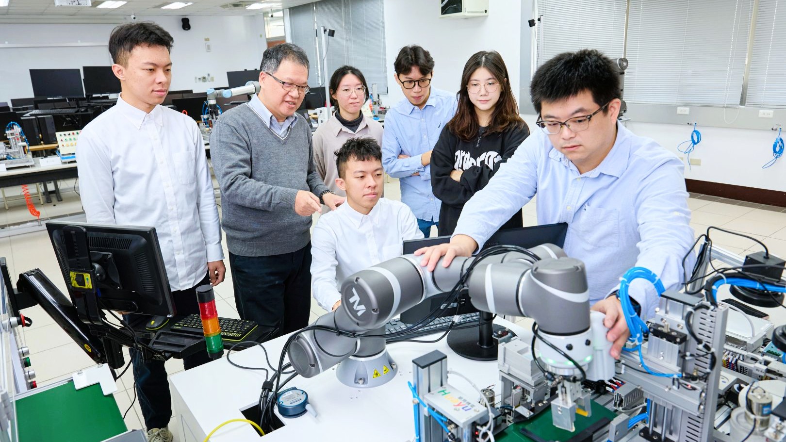 「我們改變作法,將過去每個系所一年約三百至五百萬的設備、器材採購經費,從平均分配給每位教師改由系所統籌規劃,」黃茂全以電機工程系的「高階PLC智能產線實驗室」為例,為了因應半導體產業和人工智慧的蓬勃發展,透過虛擬實境和擴增實境互動裝置、工業用機械手臂等,開發出各種人臉、物件辨識技術,設計了可以自動辨識存貨數量的智慧型超市系統,以實際的研發訓練培育未來產業需要的人才。(圖 / 亞東科大提供)