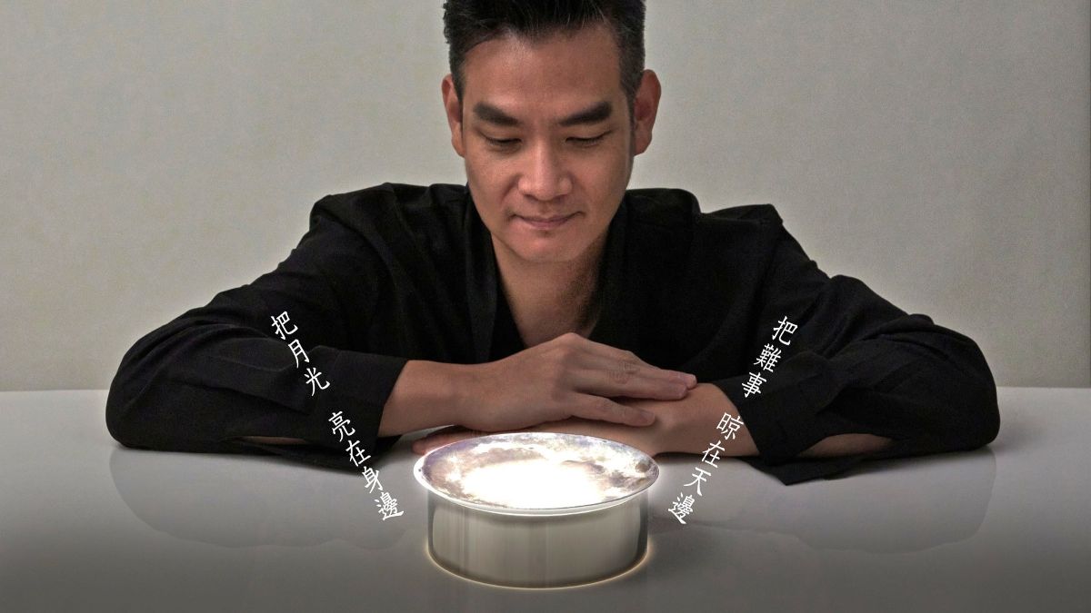 陳彥彰表示,「月光盤」以極薄骨瓷窯燒,運用其高度透光特性,作品的創作靈感源自中秋節「吃月餅」的儀式感逐漸被烤肉文化取代,設計團隊重新詮釋中秋團聚的文化意象,讓月光成為凝聚家庭情感的象徵。「月光盤」在中秋過後仍可作為小夜燈使用,讓節慶意象延伸至日常生活。
