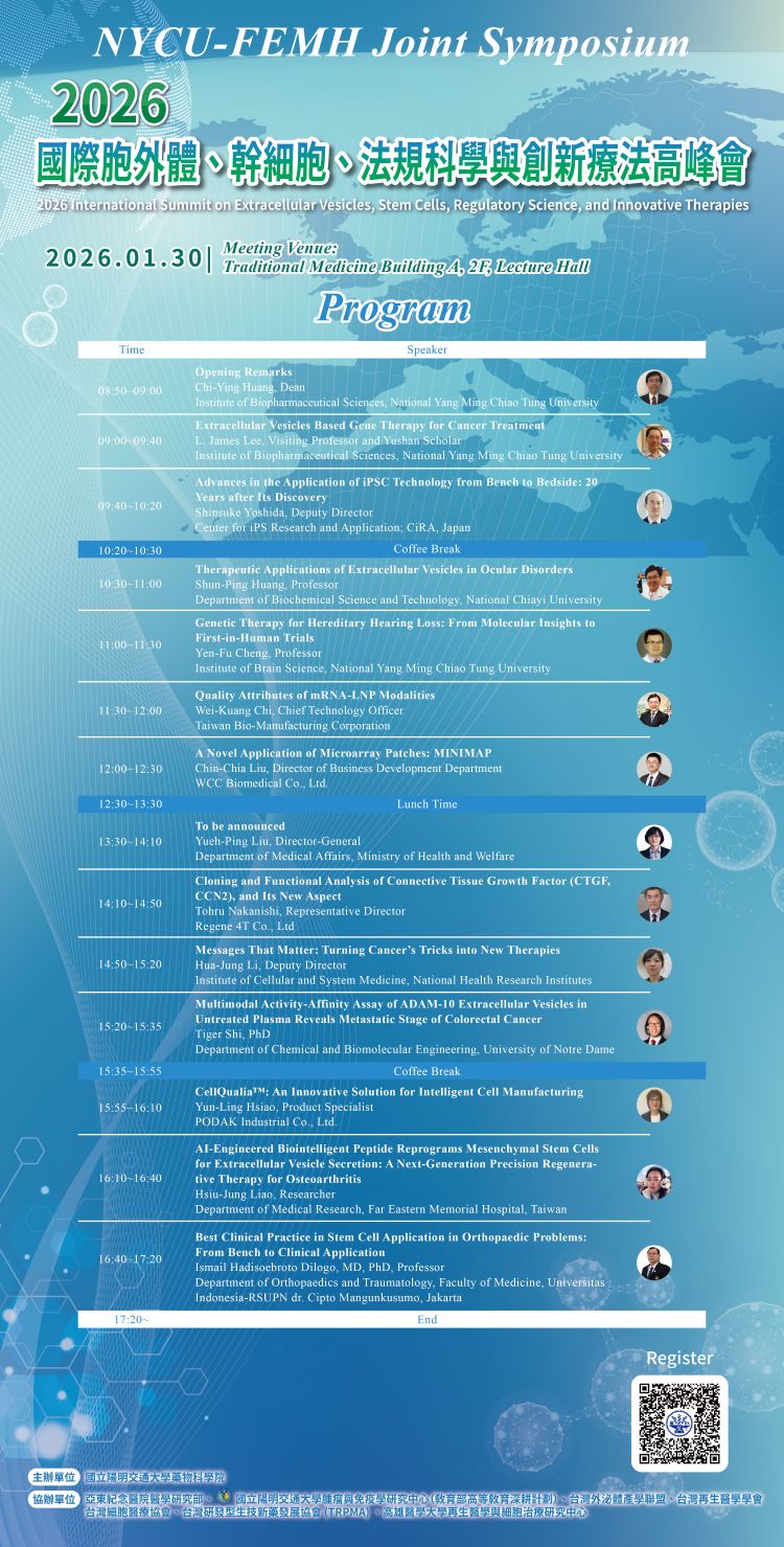 在全球再生醫療快速發展的趨勢下,胞外體與幹細胞技術正加速從研究前沿邁向臨床與產業應用。主辦單位期盼透過「2026國際胞外體、幹細胞、法規科學與創新療法高峰會」,深化國際交流與跨域合作,在確保安全與品質的前提下,加速創新療法臨床落實,為病患帶來更多治療新希望,並推動臺灣再生醫療接軌國際、邁向新里程碑。