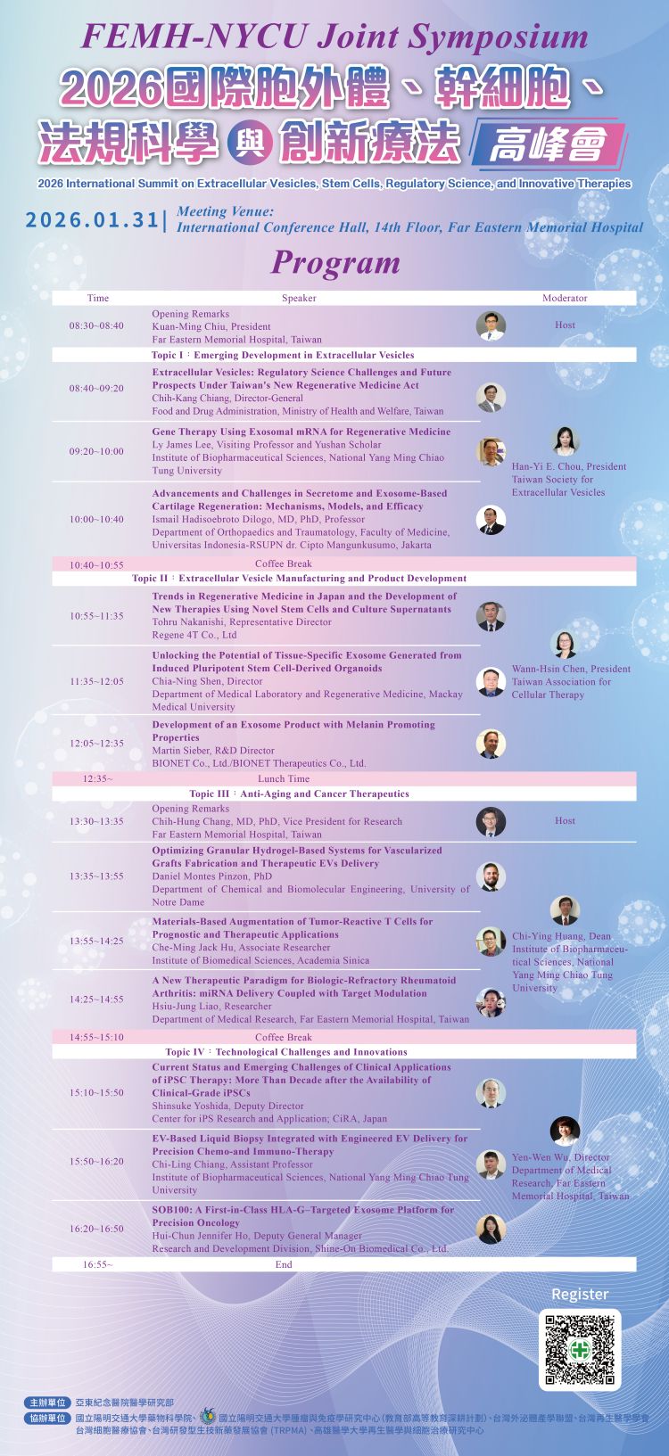 從實驗室的小小「細胞包裹」到臨床應用的實際治療,每一步都充滿挑戰與未知。本次高峰會邀集國內外於胞外體、幹細胞、再生醫療、法規科學與創新療法等領域具代表性的專家學者、主管機關代表與產業先進,深入探討從基礎研究到臨床試驗的各項挑戰,包括製程標準化、品質控管、法規遵循與臨床安全性評估。與會者將有機會聆聽國際最新研究成果,掌握全球產業趨勢,搶先掌握未來研發風向。