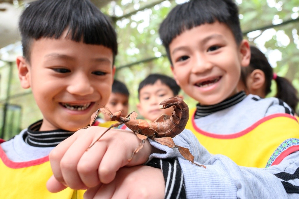 亞泥打造生態園區,結合自然生態保育與環境教育,陪伴孩子認識生態。孩子近距離觀察竹節蟲,透過實際接觸認識昆蟲的擬態與生態特性。(亞泥提供)