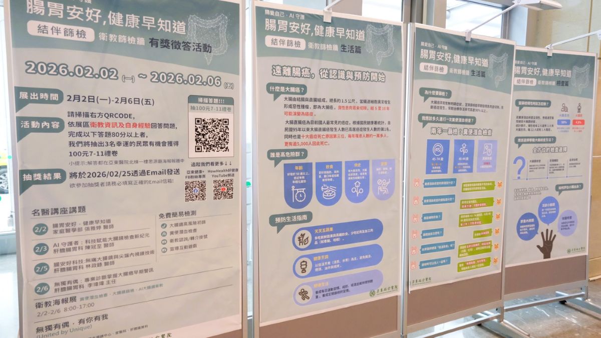為提醒民眾把握預防的黃金時間,亞東醫院響應 2 月 4 日「世界癌症日(World Cancer Day)」,自今(2)日起舉辦「腸胃安好,健康早知道」健康週活動。活動期間,民眾可接受免費大腸癌風險評估與糞便潛血檢查諮詢,在輕鬆無壓力的情境下了解自身風險,再決定是否進一步檢查。