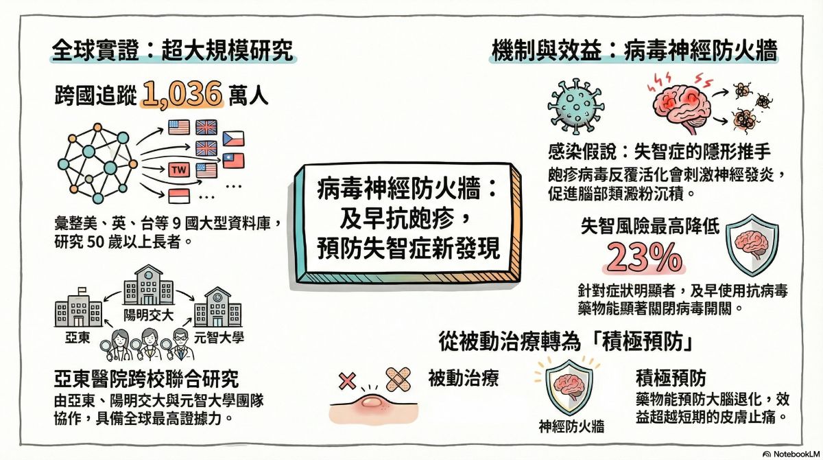 亞東醫院、國立陽明交通大學與元智大學組成跨國研究團隊,分析全球超過 1,036萬50 歲以上長者後發現:及早使用「抗皰疹病毒藥物」,能顯著降低失智症風險,最高降幅高達 23%。這項研究成果已於近期刊登於國際權威期刊《Journal of Alzheimer’s Disease》。(圖 / 依新聞稿內容由Notebook LM 製作)