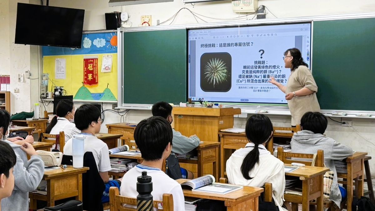 自然與生活科技科教師則以「焰色與煙火」為主題,帶領學生認識不同金屬元素的焰色反應,並透過大型觸控螢幕設計互動遊戲「焰色煙火競技場」,讓學生在趣味競賽中觀察與判斷焰色變化,將抽象的科學概念轉化為生動的學習體驗。