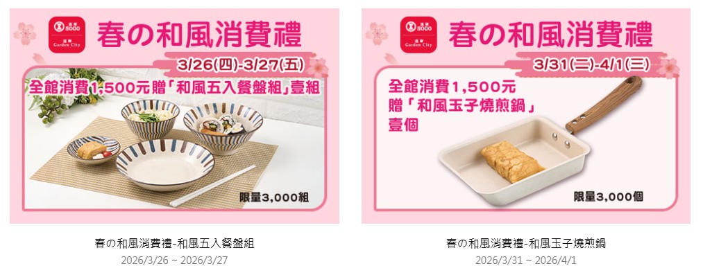 消費滿額還有多款春季和風消費禮可擁有,3/20(五)起於指定活動日期與地點消費滿額,可獲得「日本展150元電子折價券」、「和風五入餐盤」、「和風玉子燒煎鍋」..等好禮。(圖 / 遠東SOGO官網) 好康不僅於此,自3/26(四)起再推出金喜刷活動,刷指定銀行信用卡累積消費滿5000元即可兌換「4%電子抵用券」,刷SOGO中信聯名卡最高享7%,回饋無上限。