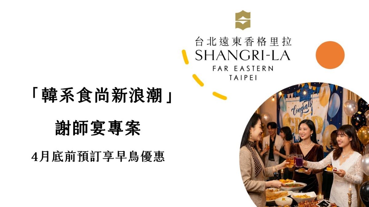 畢業季的儀式感,從一場韓風襲捲的食尚派對開始!台北遠東香格里拉於5月1日至8月31日推出「2026謝師宴專案」,將熱門的「韓系食尚」搬進五星級宴會廳。4月30日前簽約付訂享早鳥免一成服務費,且滿40位加贈一位師長免費。菜單規劃五大類及超過15道自助美饌,亮點為2大現點現做攤位,主廚推出創意「髒炸薯條」與「嫩烤豬肋漢堡」。搭配專業舞池、KTV及拍貼機,鎖定社群限動焦點。專案適用40人 (含)以上訂位,每位1,550+10%元。詳情請洽宴會業務部 (02)2378-8888轉分機6024。