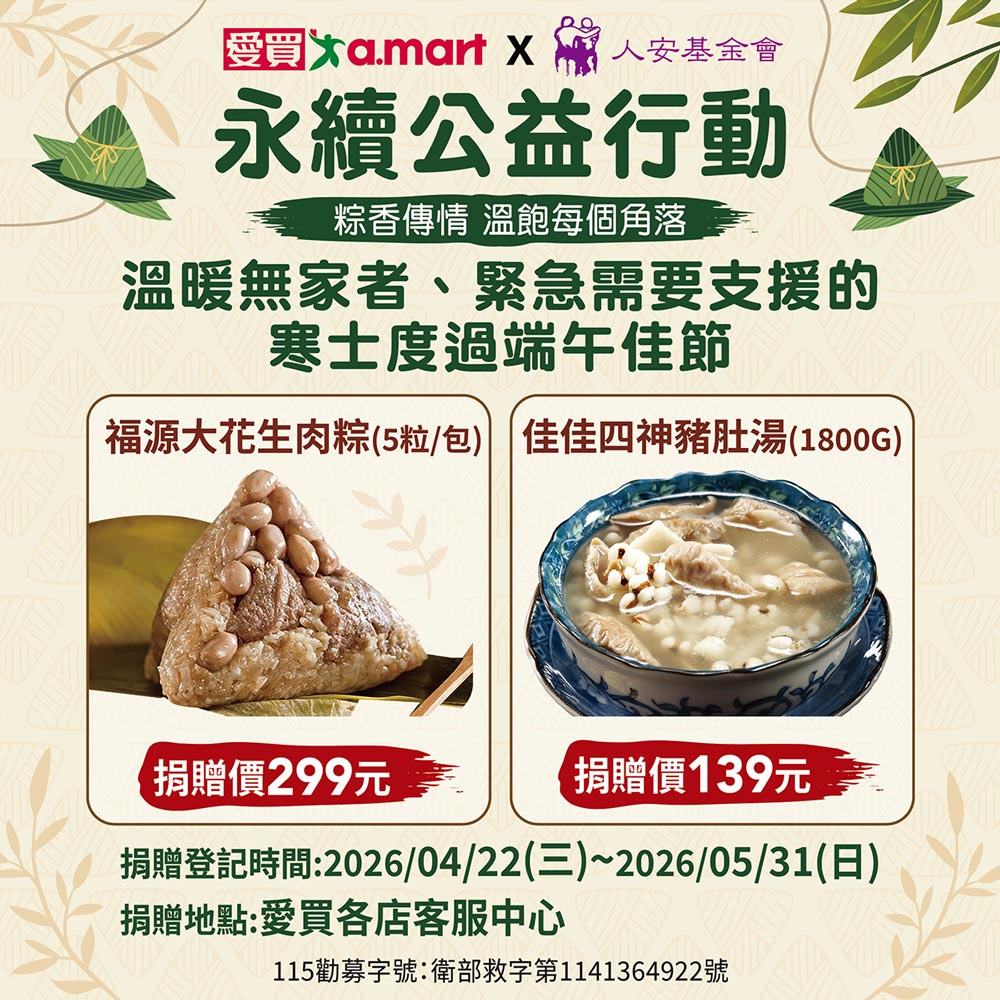 端午佳節將至,為讓弱勢族群也能感受到節日的溫暖,愛買發起「端午節公益粽子認購」活動,號召消費者一同捐贈應景粽子,由人安基金會協助發放,把關懷送到社會的每一個角落。